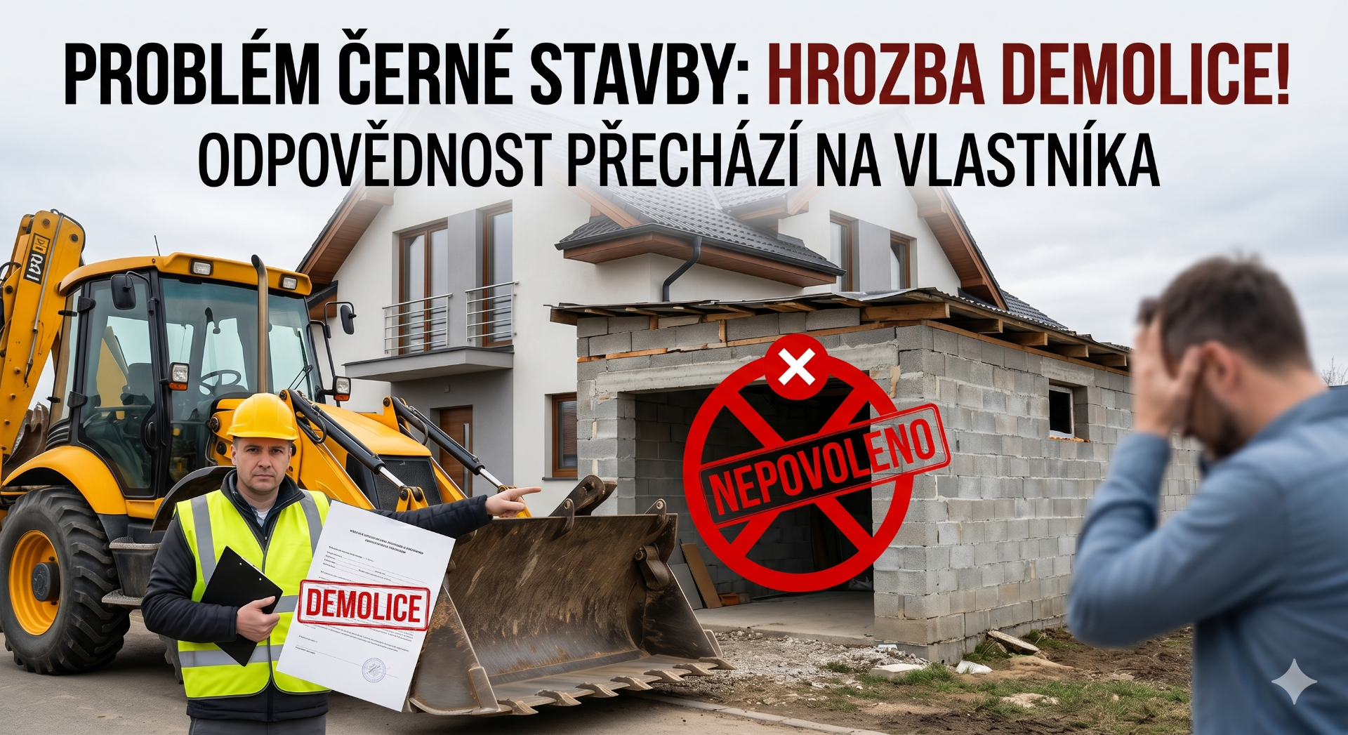 Při prodeji nemovitosti se všichni soustředí na cenu, krásné fotky a rychlost prodeje. Je tu ale jeden zásadní problém, který dokáže zablokovat jakýkoliv obchod nebo zničit dohodu o majetku. Tzv. černá stavba. A pozor – vůbec nemusí jít o tajně postavený dům. Velmi často se jedná "jen" o načerno přistavěnou garáž, rozšířenou terasu, zimní zahradu nebo obytné podkroví, které chybí v katastrálních mapách.